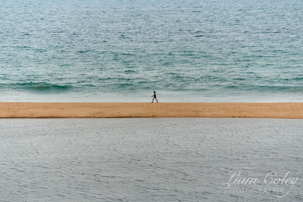 A lone figure walks along the beach.