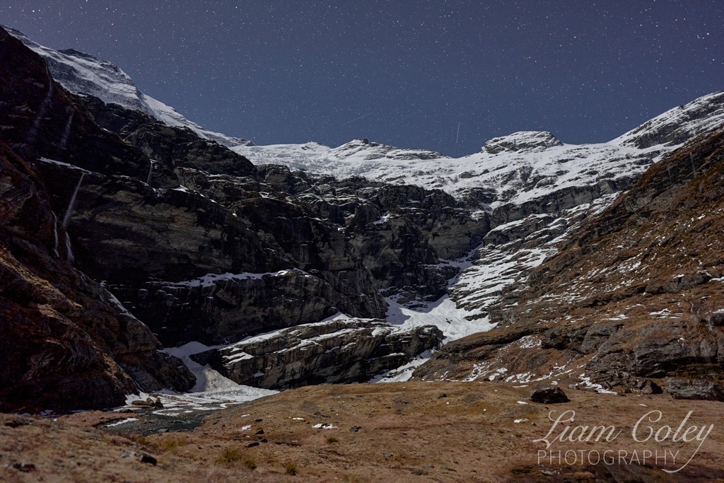 The last vestige of the Earnslaw Glacier, lit up by moonlight.