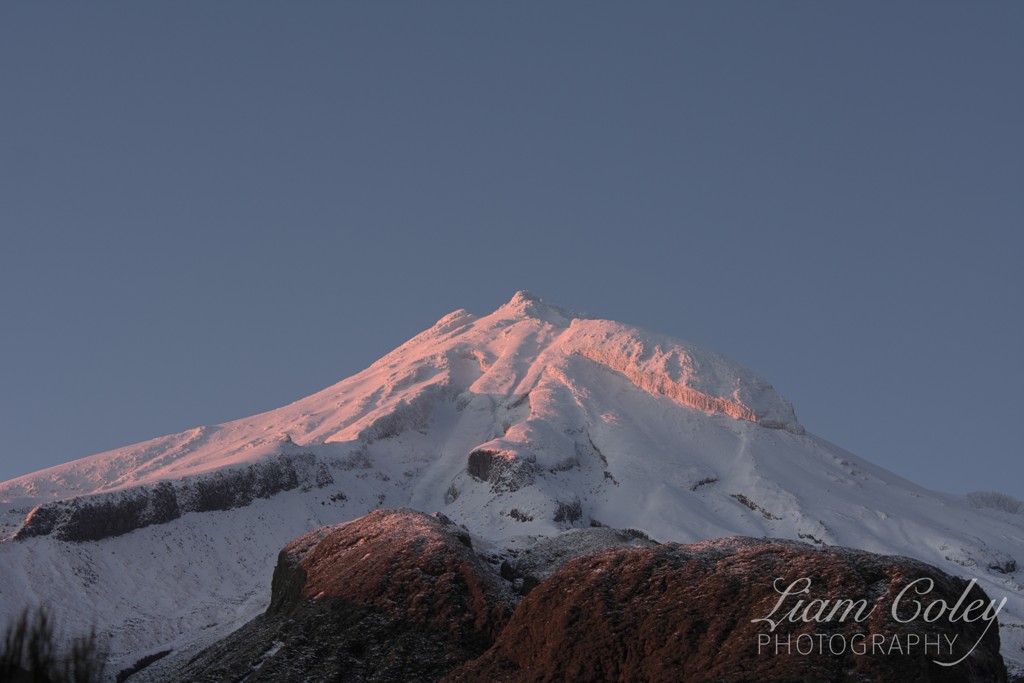 Mt Taranaki turns pink at first light.