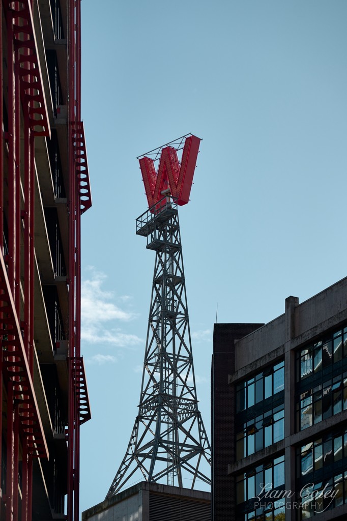 The iconic red 'W' atop Woodward's Building.