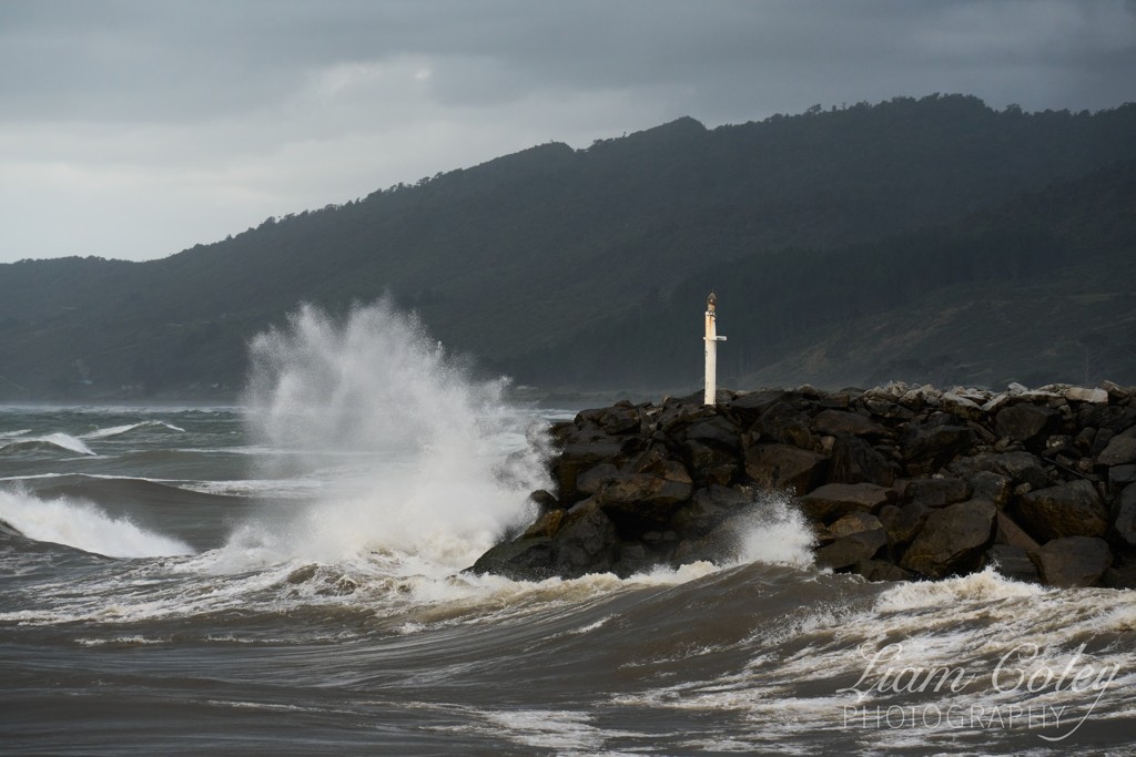 Waves batter the breakwater.