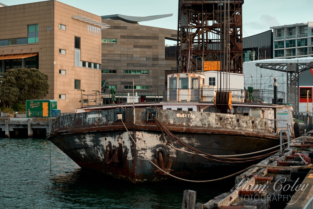 An old ship, moored on the Wellington waterfront.