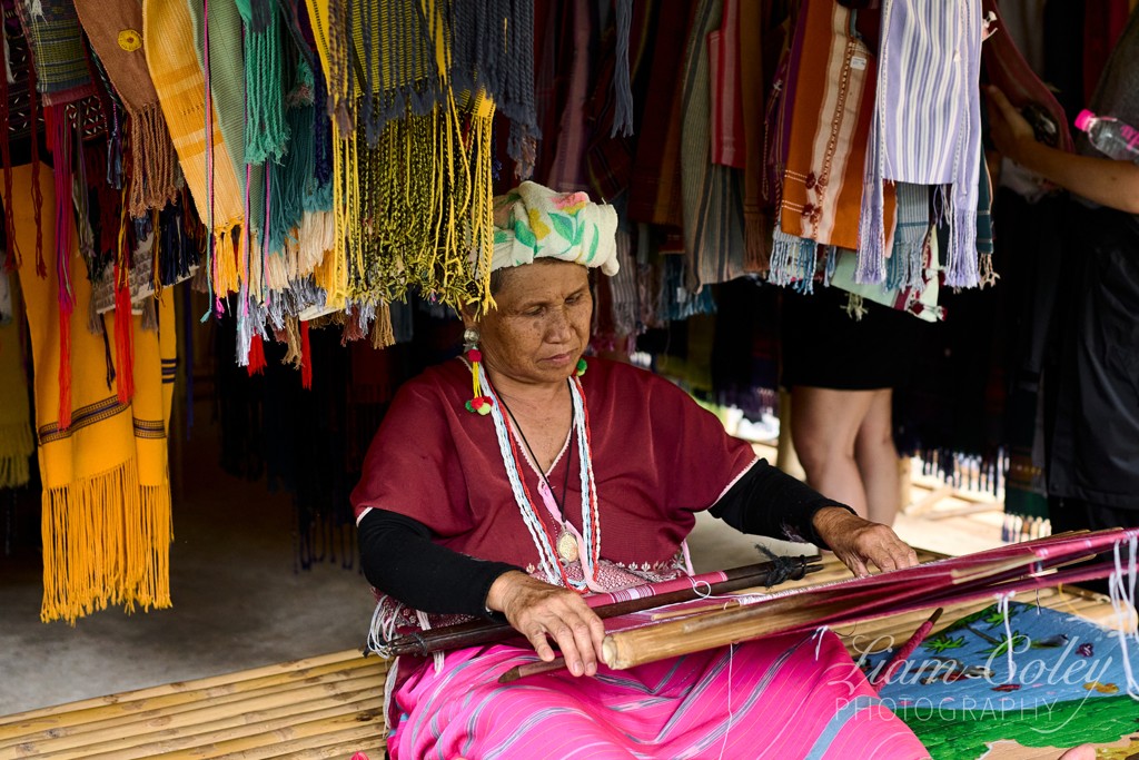 A weaver of the Karen Hill Tribe, wearing traditional dress.