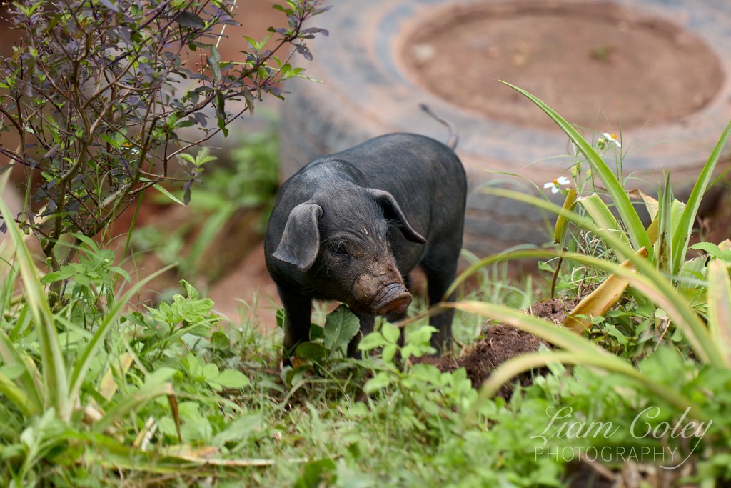 A piglet enjoys the lush scenery.