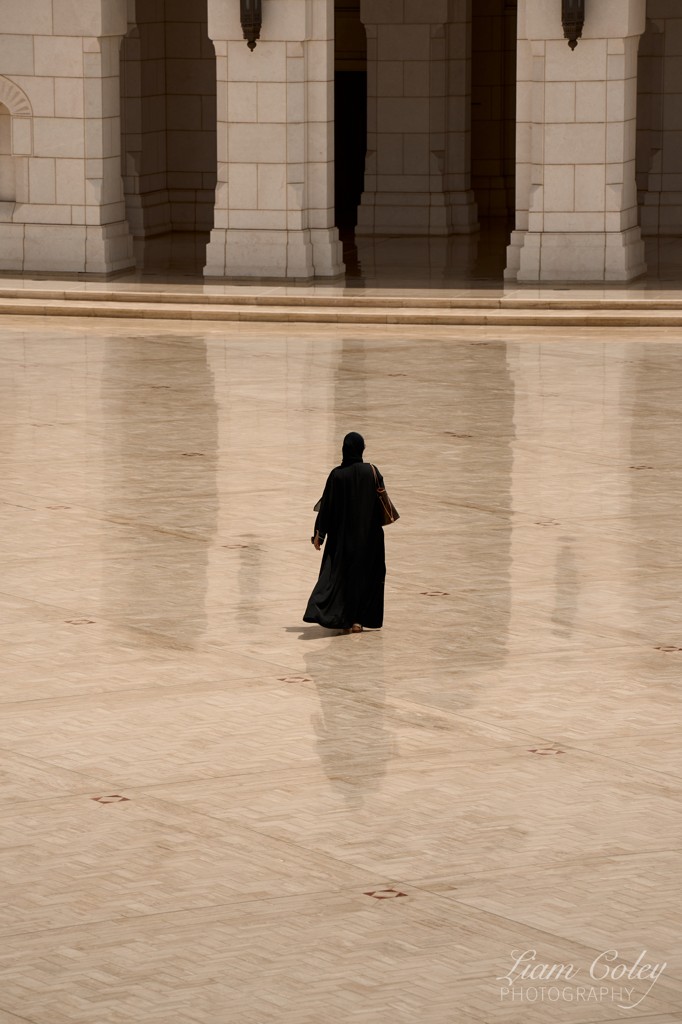A woman traverses the polished marble entrance to the Royal Omani Opera Houses.