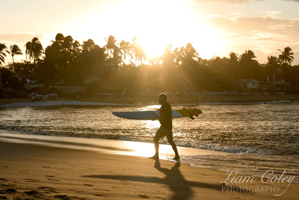 A surfer is silhouetted by the setting sun at Arugam Bay's Main Beach.