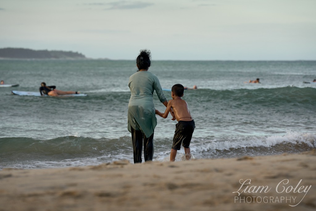 A child resists his mother's attempts to get him into the water.