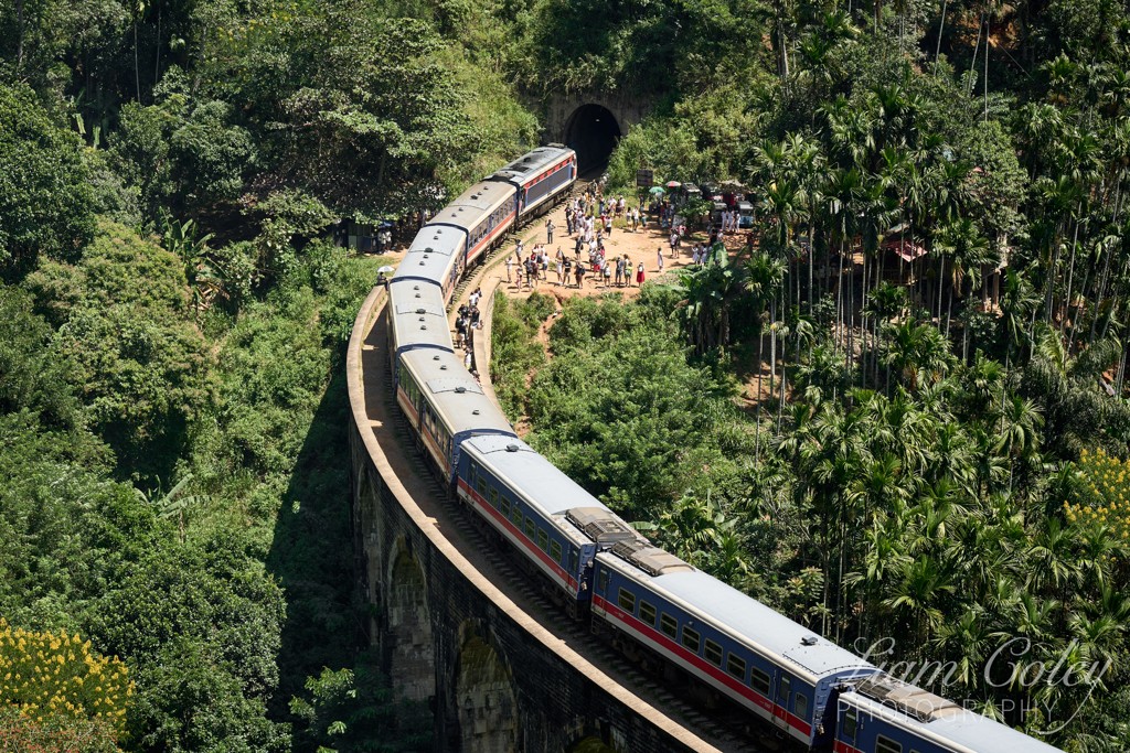 A train enters the tunnel after crossing the Nine Arches Bridge.