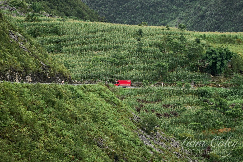 A vibrant red truck stands out amongst the greenery of Northern Vietnam.